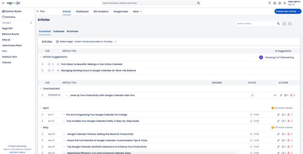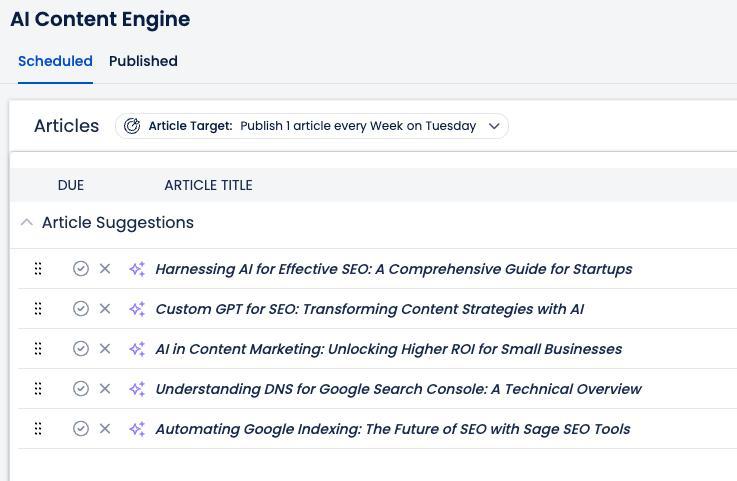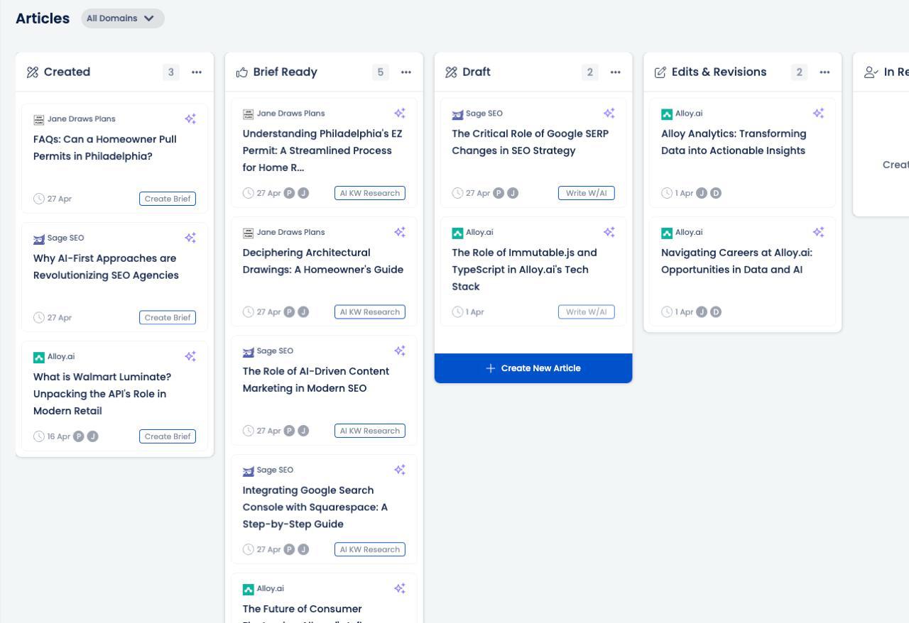 Sage SEO gives you a full-stack content pipeline that shows exactly where every article lives—from brainstorm to published.